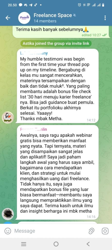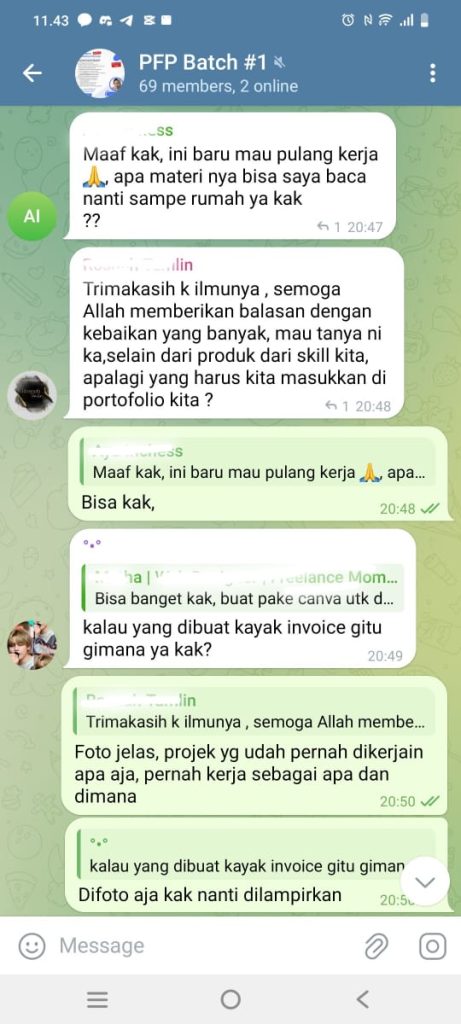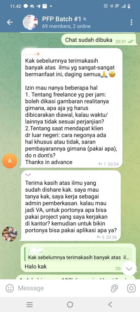 Kelas diadakan secara online melalui Telegram. Setelah mendaftar, kamu akan mendapatkan akses ke grup eksklusif.